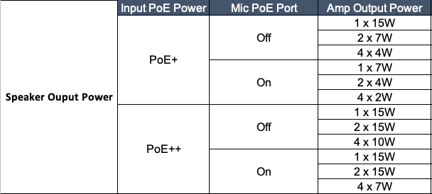 The output power of Sonia Amp is dependent on the PoE input power and PoE Mic Port connection. Please see the table below for the output power rating for each scenario: