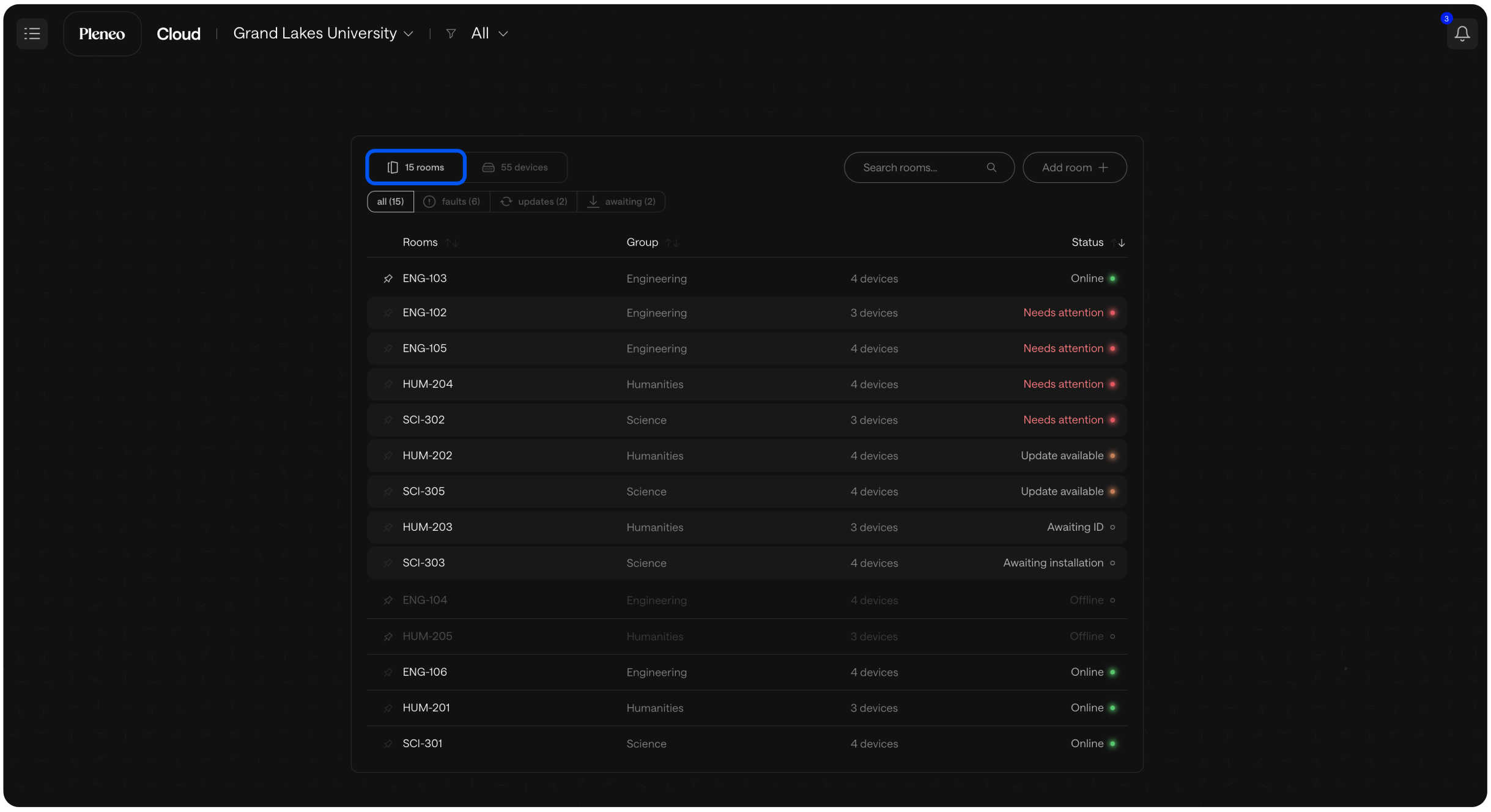 In the main view, you can easily switch between viewing your Pleneo Rooms or seeing all devices within those rooms.