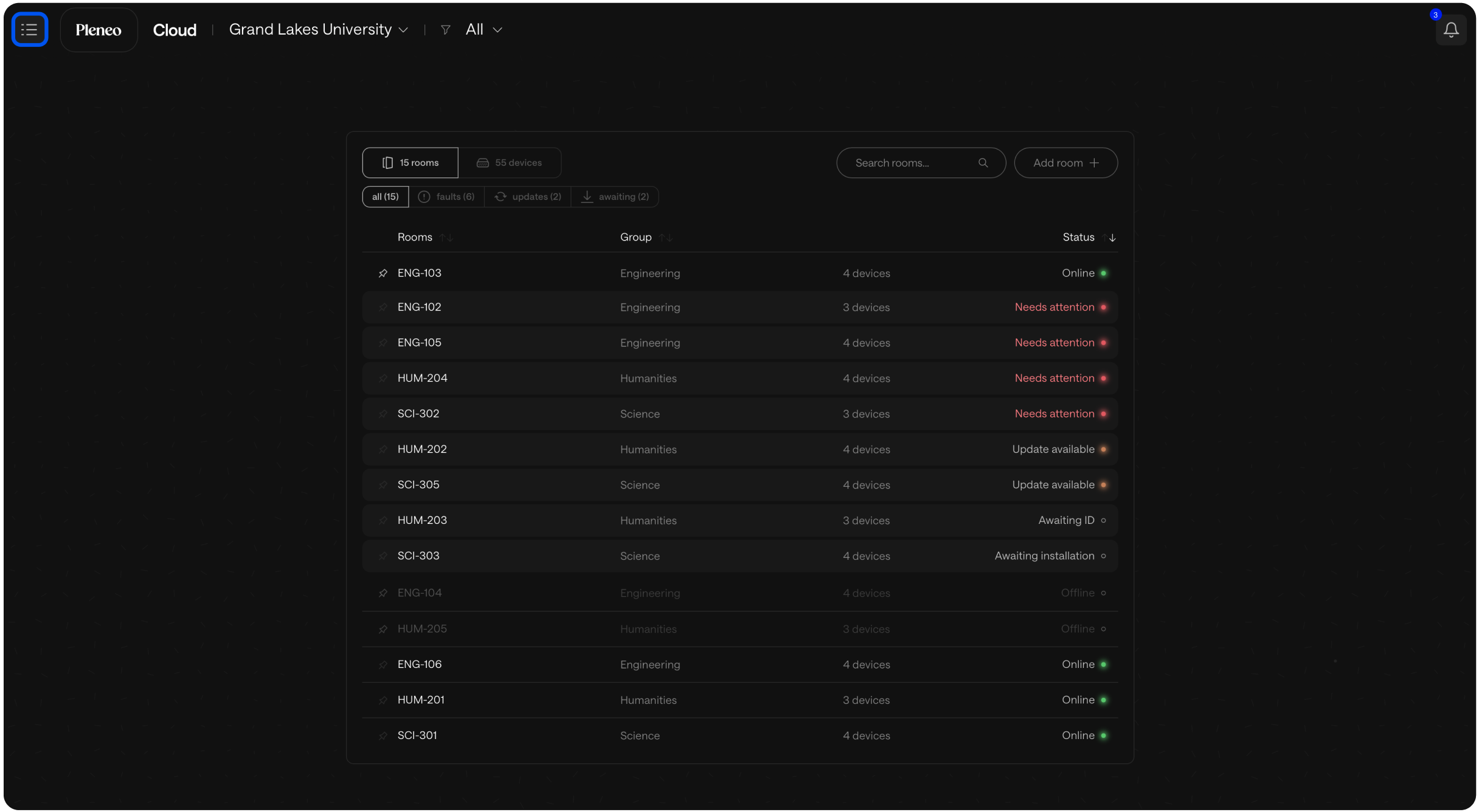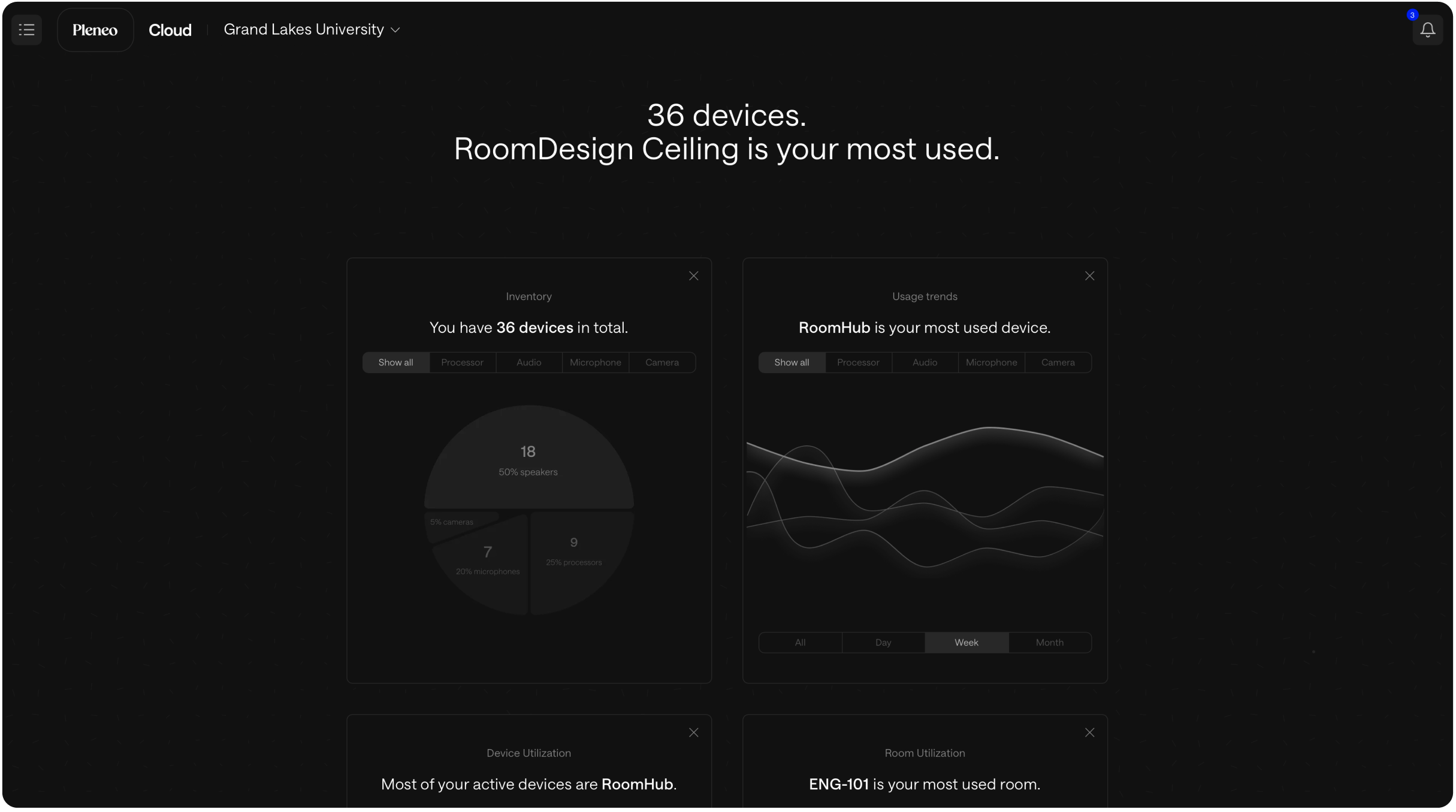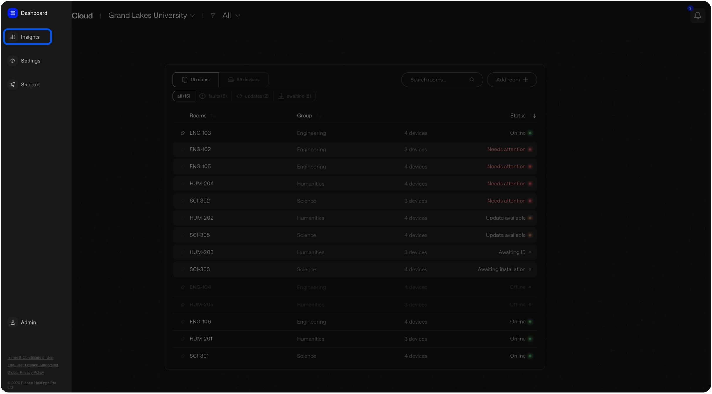 Pleneo Cloud collects data from your Pleneo Rooms and turns it into clear, actionable system insights.
