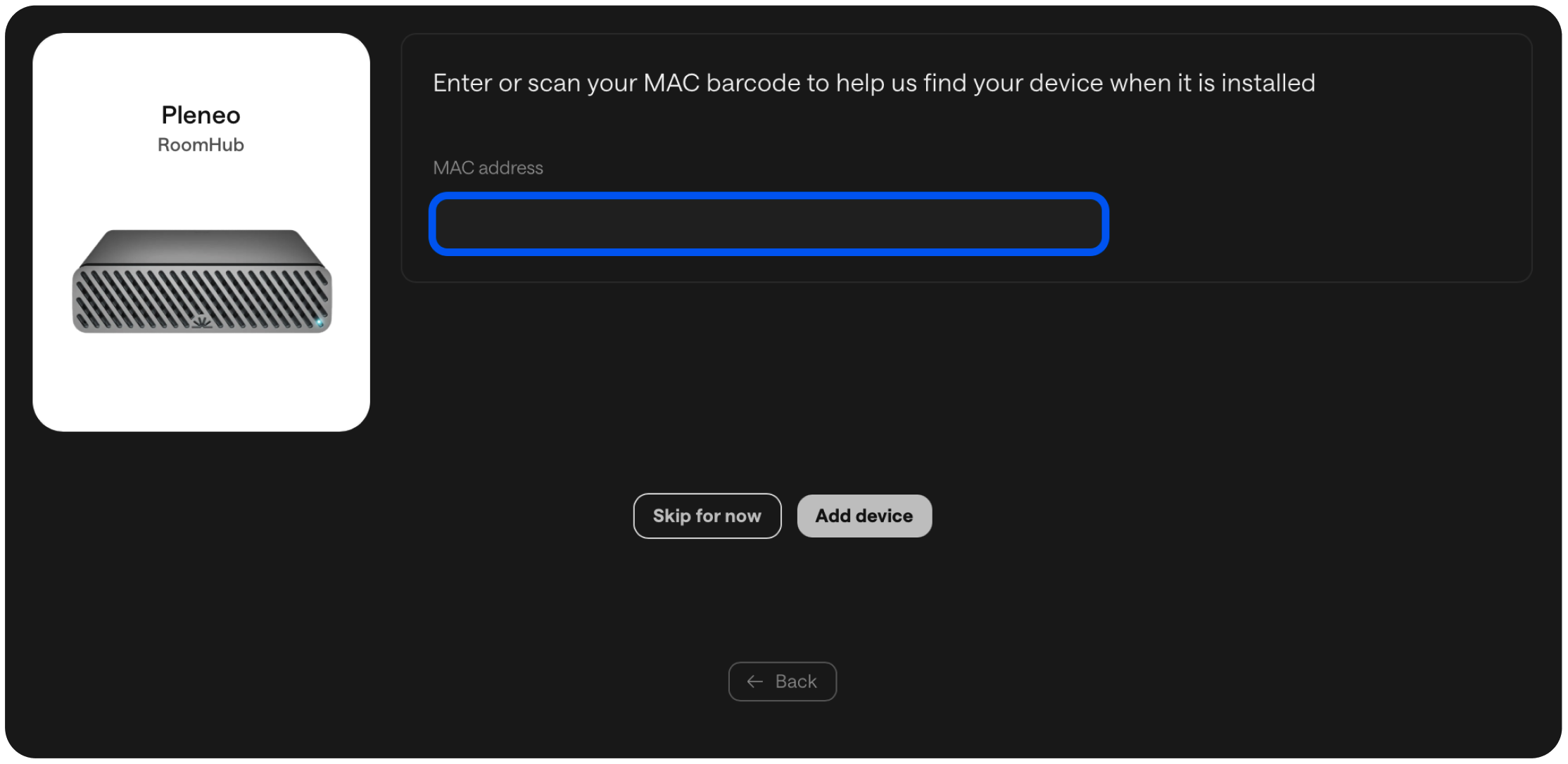 Enter the RoomHub MAC address so Pleneo Cloud can discover it automatically on the network.