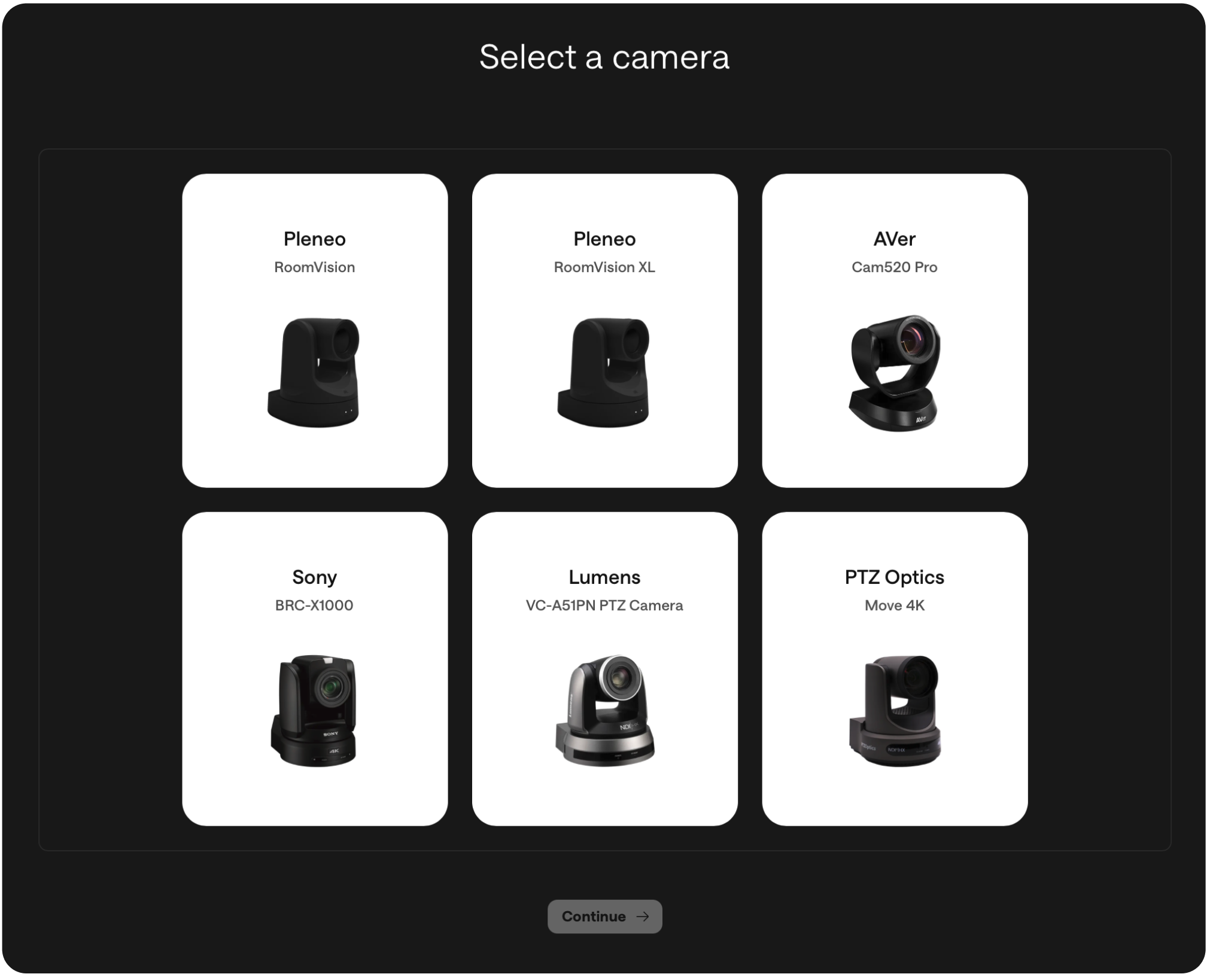We have our own cameras, RoomVision, and we support the most popular PTZ-cameras from the major brands.