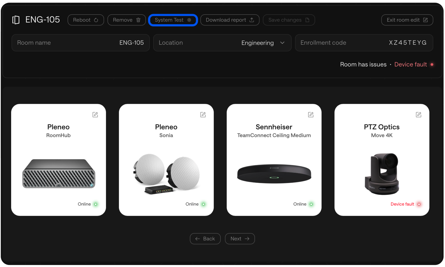 A System Test checks all devices assigned to the room, helping you confirm that everything is connected, functioning, and ready for use.
