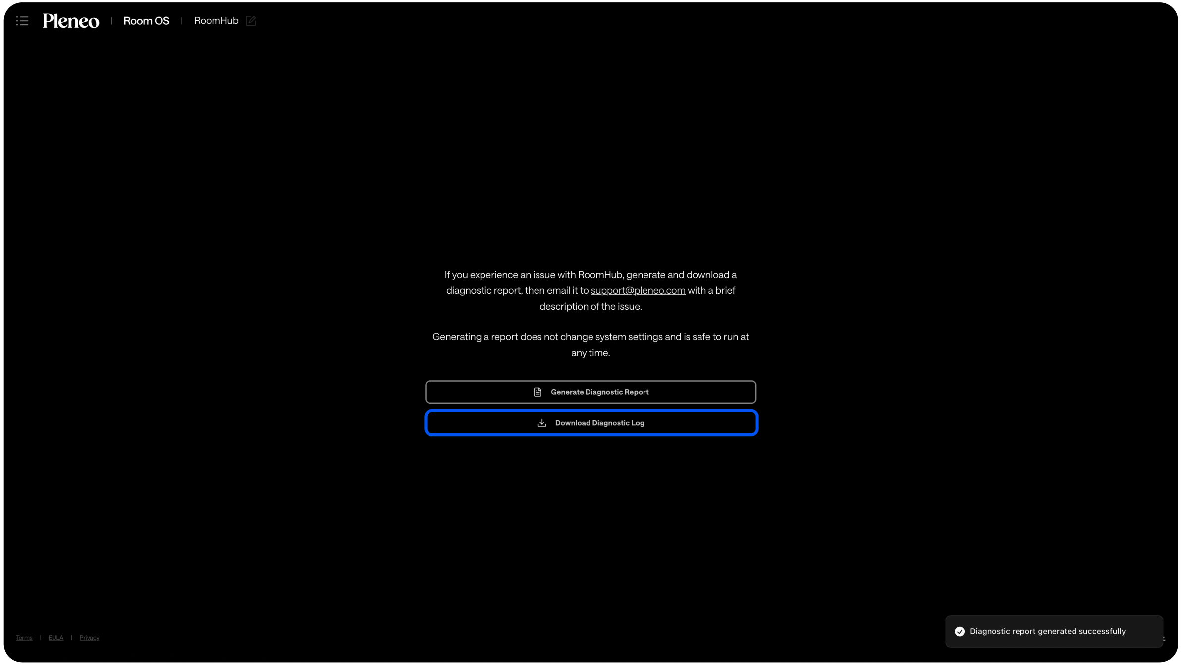 If you experience an issue with RoomHub, you can quickly generate a diagnostic report.